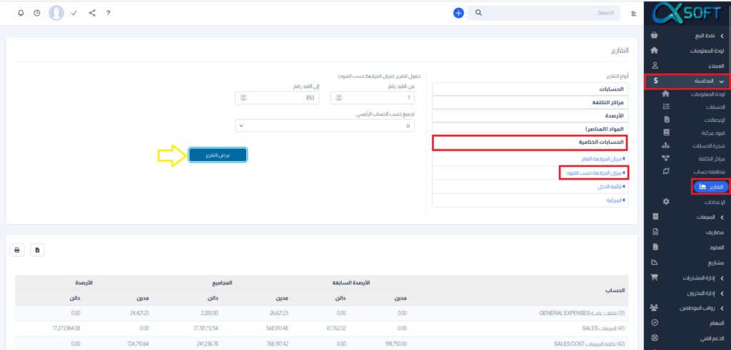 تقرير ميزان المراجعة العام:توجد الحقول التالية: