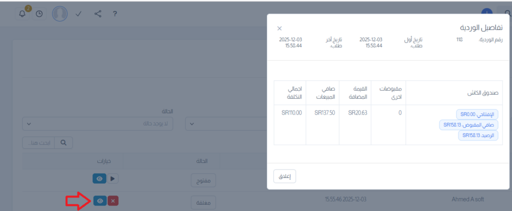 سوف تظهر لك كافة التفاصيل مثل المقبوضات النقدية والمقبوضات بطرق الدع الأخرى وتاريخ آخر طلب وأول طلب.